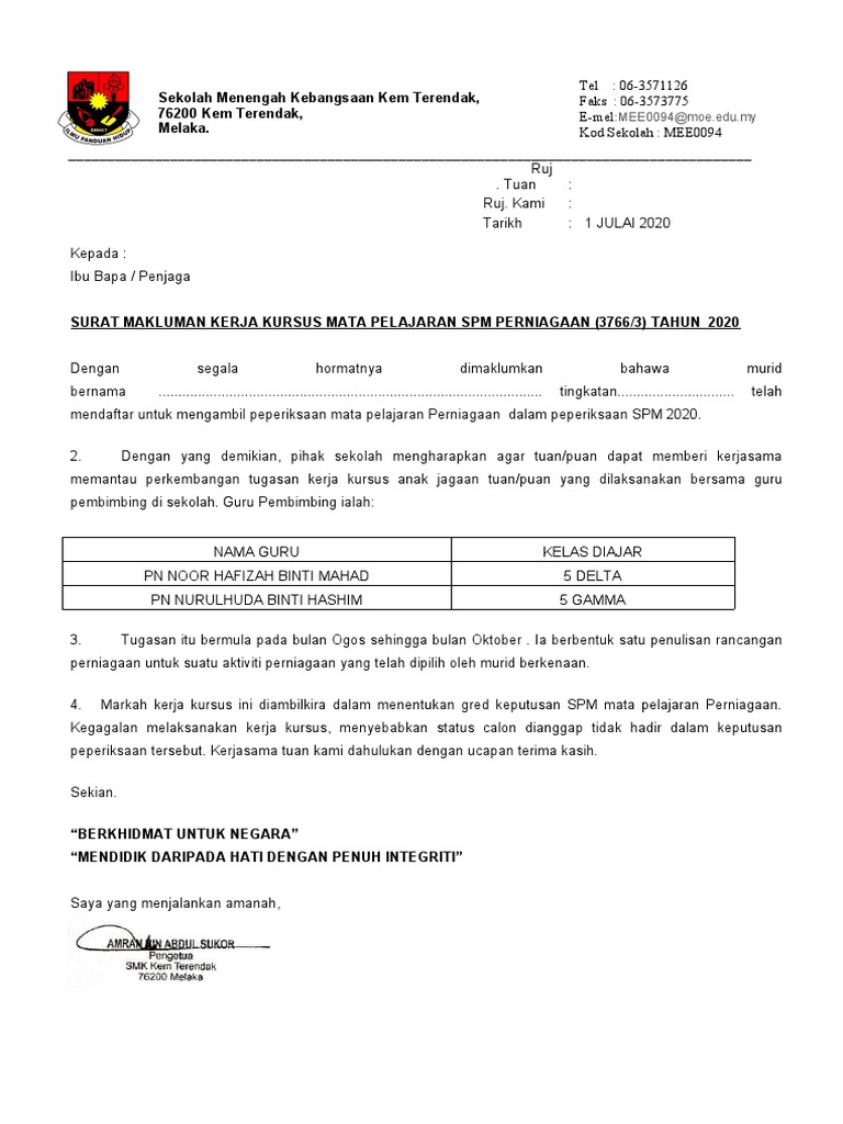 Surat Makluman Kerja Kursus Perniagaan 2020 Perniagaan Pdf