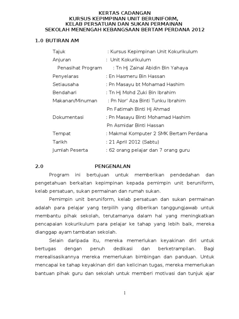 KERTAS KERJA KURSUS KEPIMPINAN KOKURIKULUM TAHUN 2020 TARIKH. Kelas masakan kampung sri siantan anjuran. Sama seperti pengenalan dalam proposal kerja kursus tetapi panjangnya mesti tidak lebih daripada 34 mukasurat.